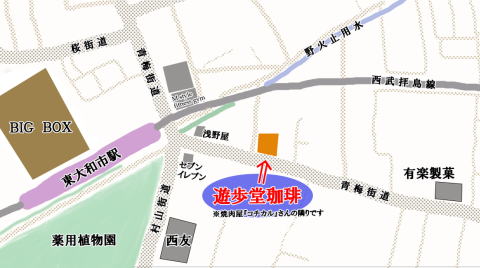 西武新宿線「東大和市」駅より徒歩3分。 改札を出てすぐ右折します。細い歩道に突き当たるので、そちらを左折。 信号を渡り、青梅街道を100mほど直進すると、「焼肉コチカル」さんが見えてきますので、その隣です。